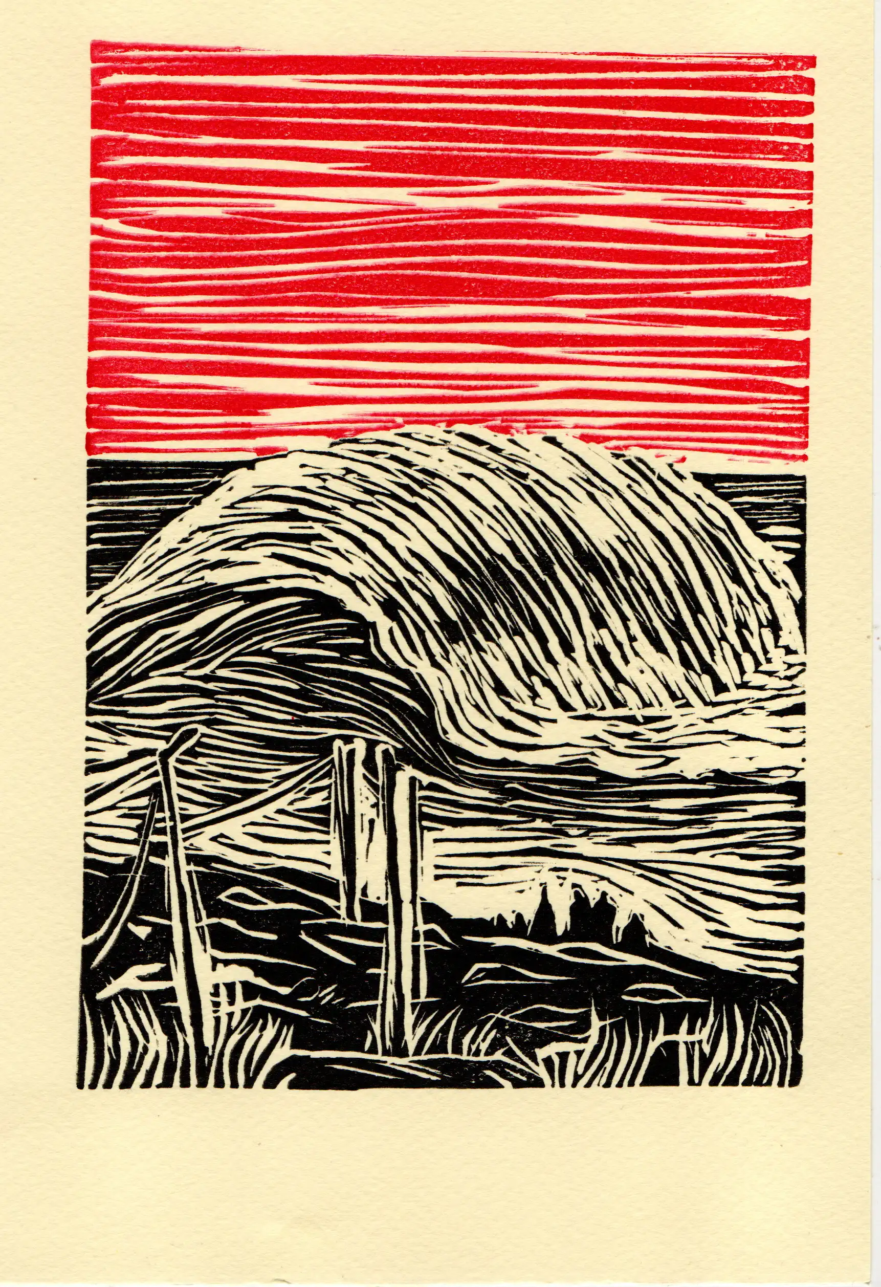 Nazare postal ou gravura com expressao popular "tá mar à pedra". Cor azul na onda e céu vermelho. Feito em linóleo. cor preto. Feito por wait4art, arte feita por nós especialmente para ti! wait4art.pt